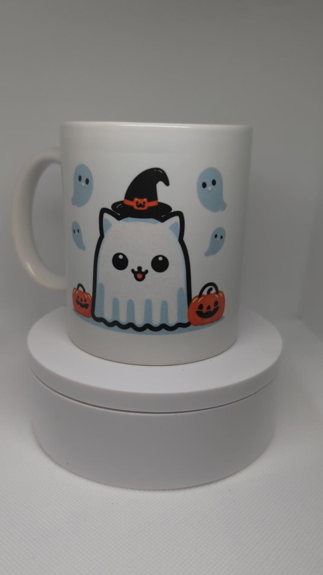Get into the spooky spirit with our Glow-in-the-Dark Halloween Cat Coffee Mug! This 11oz ceramic mug features a charming cartoon cat dressed in a ghost costume, surrounded by playful pumpkins and spooky ghosts. Perfect for your favorite hot beverage, this mug adds a fun and eerie touch to your Halloween celebrations.